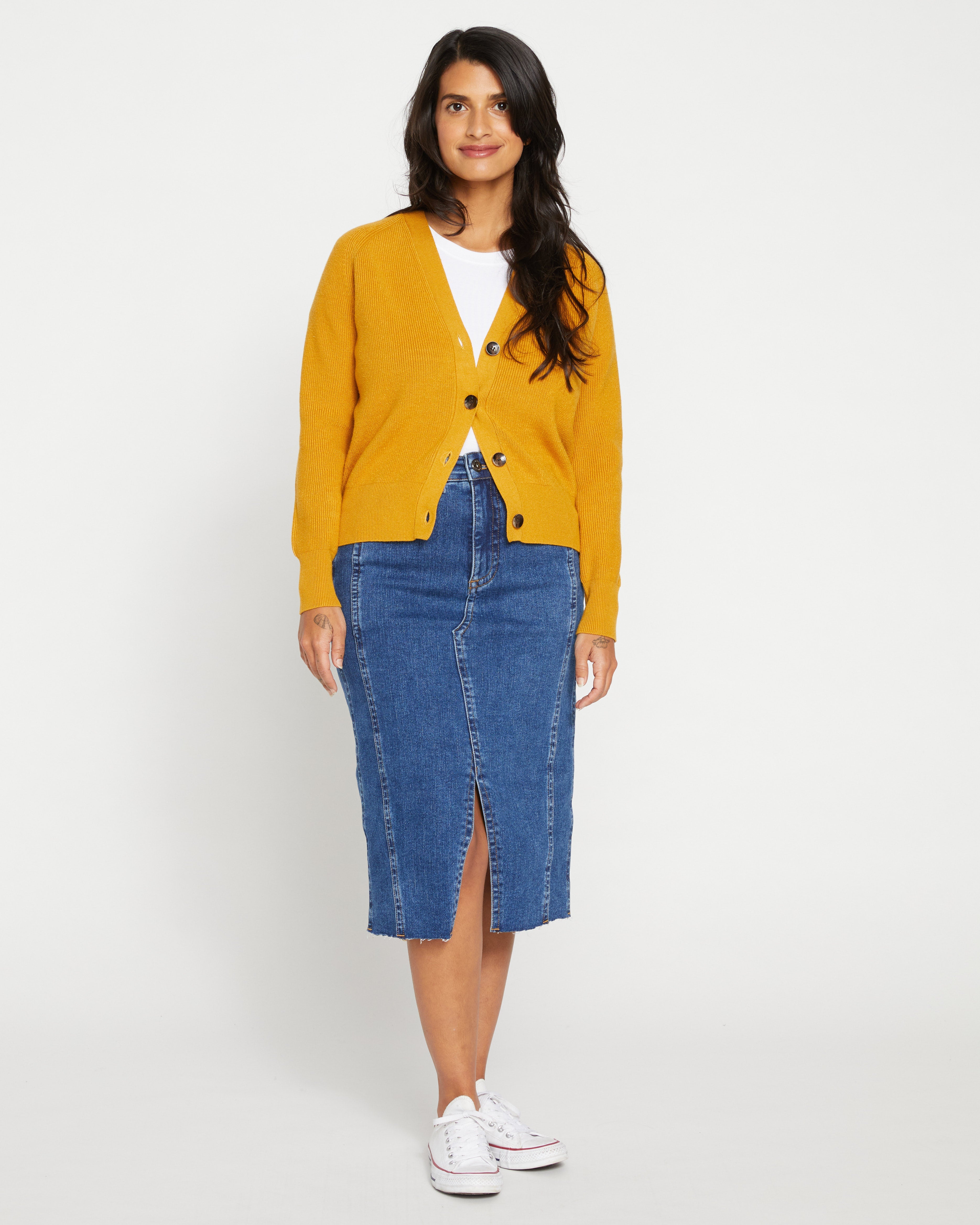 This is the denim skirt of your dreams. It's part bohemian, part western, and part fashionably modern. The perfect pencil silhouette is made from our soft denim fabric with invisible stretch and boasts a brand-new wash. With a mid-rise fit, it features a subtle deconstructed look with patchwork seaming and a raw hem. We paid particular attention to the trims and finishes—the raw hem looks clean and intentional, and the custom topstitching was chosen just for this skirt.