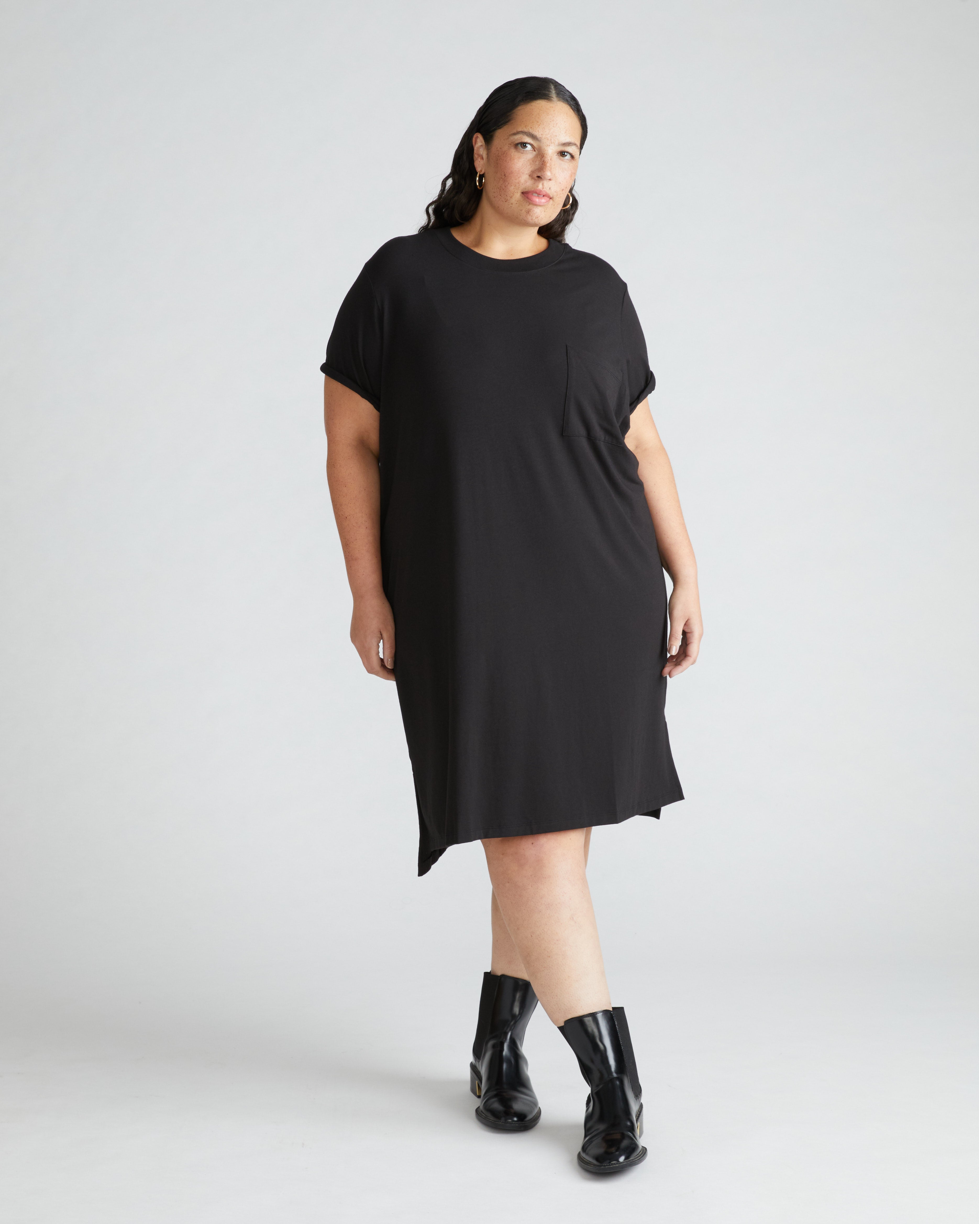 Everyone’s favorite pocket tee is now a dress. It’s made from the same premium Peruvian cotton that only gets softer with every wash. Key details include the high crew neck, short sleeves, chest pocket, and subtly curved hem. Go for the gamine look this season.