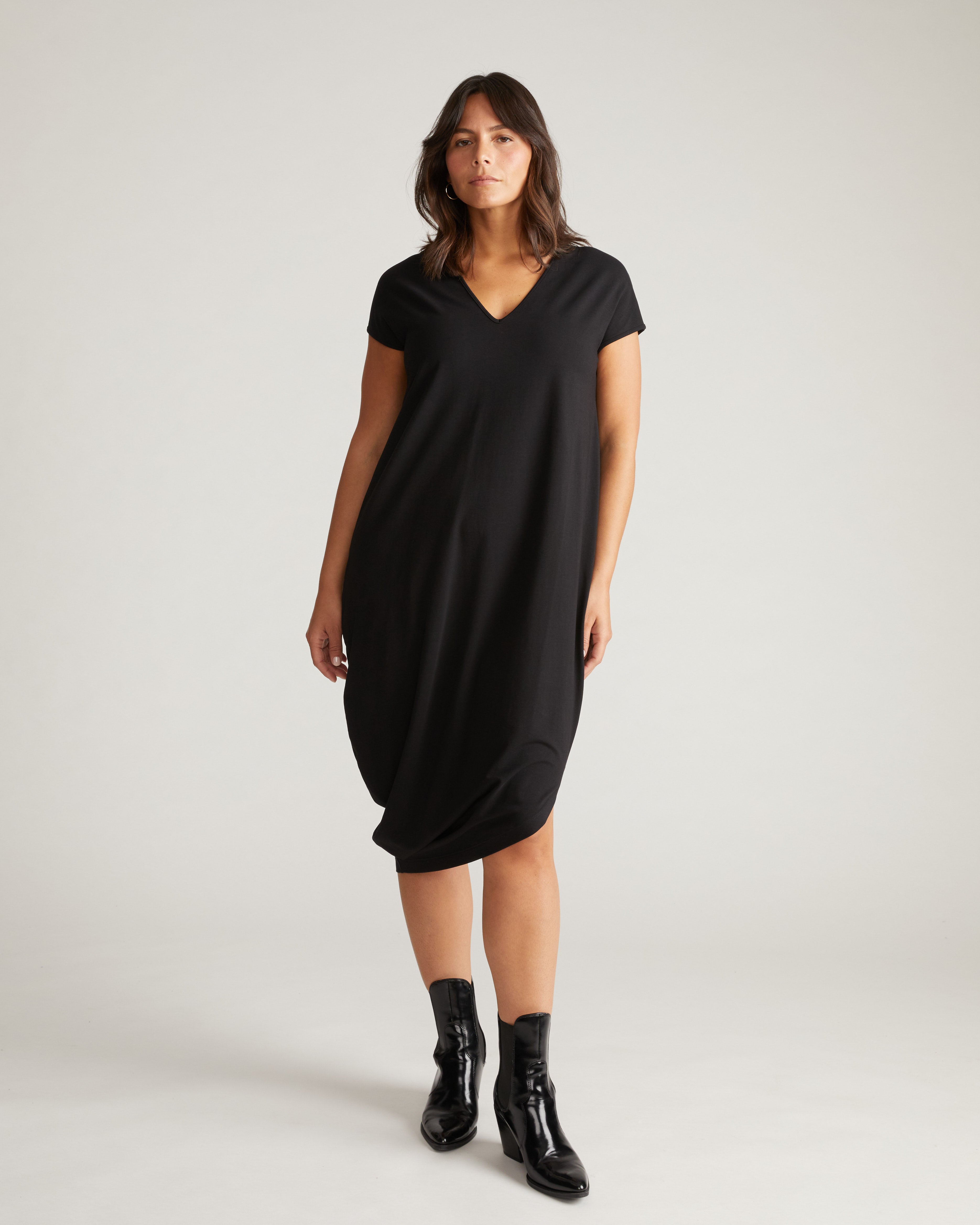 The dress that started it all - with a twist. With a narrow v-neck, this dress is versatile, stylish, and best of all, comfortable. It's the effortless option you'll reach for every time. Made from a Peruvian cotton blend we developed ourselves from the thread up, this piece is colorfast, has incredible bounce-back, and is pilling resistant.