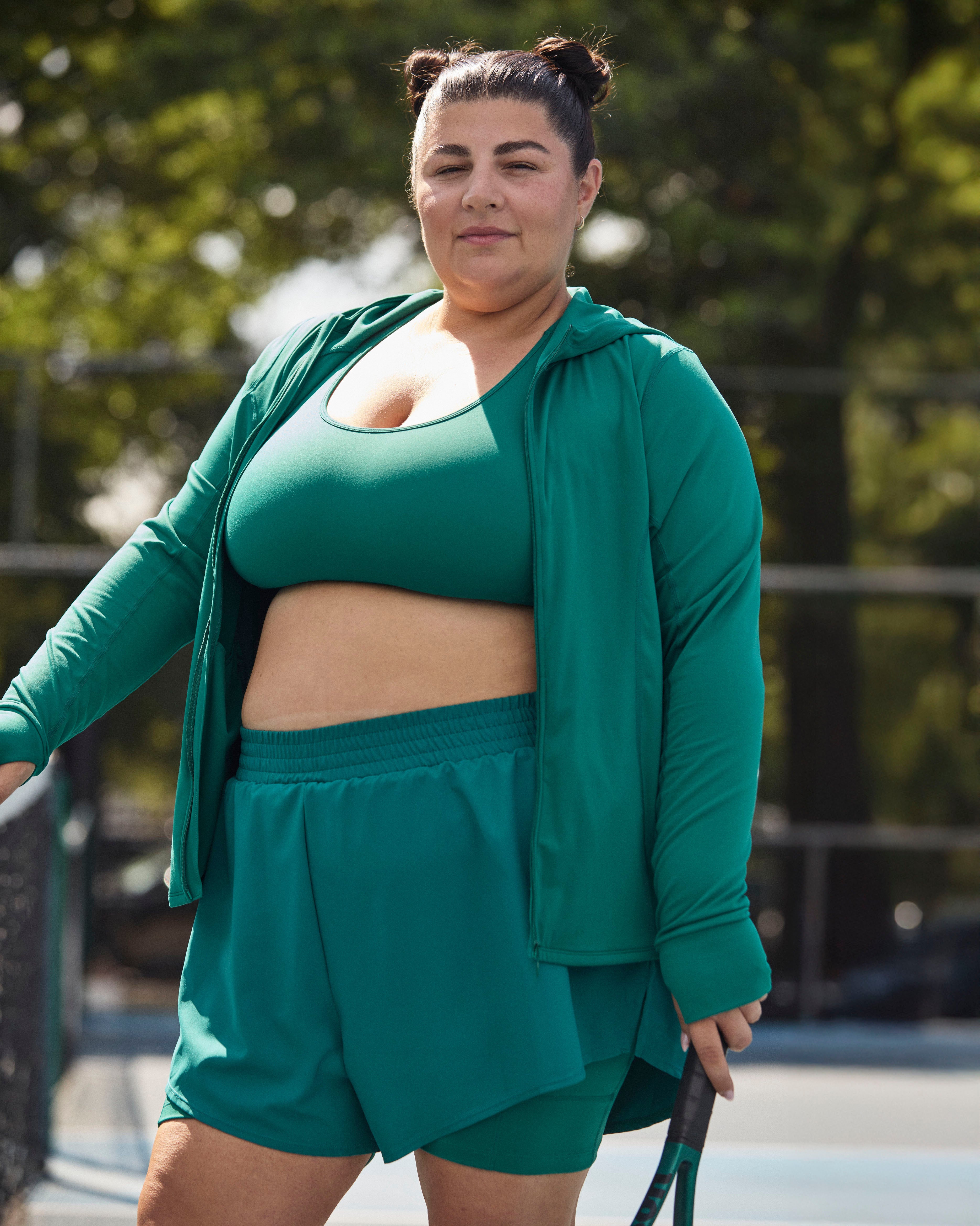 This is the layer that doesn’t feel like a layer. It’s made from a sweat-wicking, antimicrobial fabric developed by US and has a soft handfeel that creates a next-to-naked sensation as you move. When you need to throw something over your Next-to-Naked Bodysuit (or any comfy second-skin style) and you don’t want any bulk, the Next-to-Naked Hooded Zip Jacket is your go-to. Designed with contoured seams, it has a close-to-the-body fit. It’s clean and streamlined with a few key details: hood, zip front, zip pockets, and long sleeves with thumbholes.