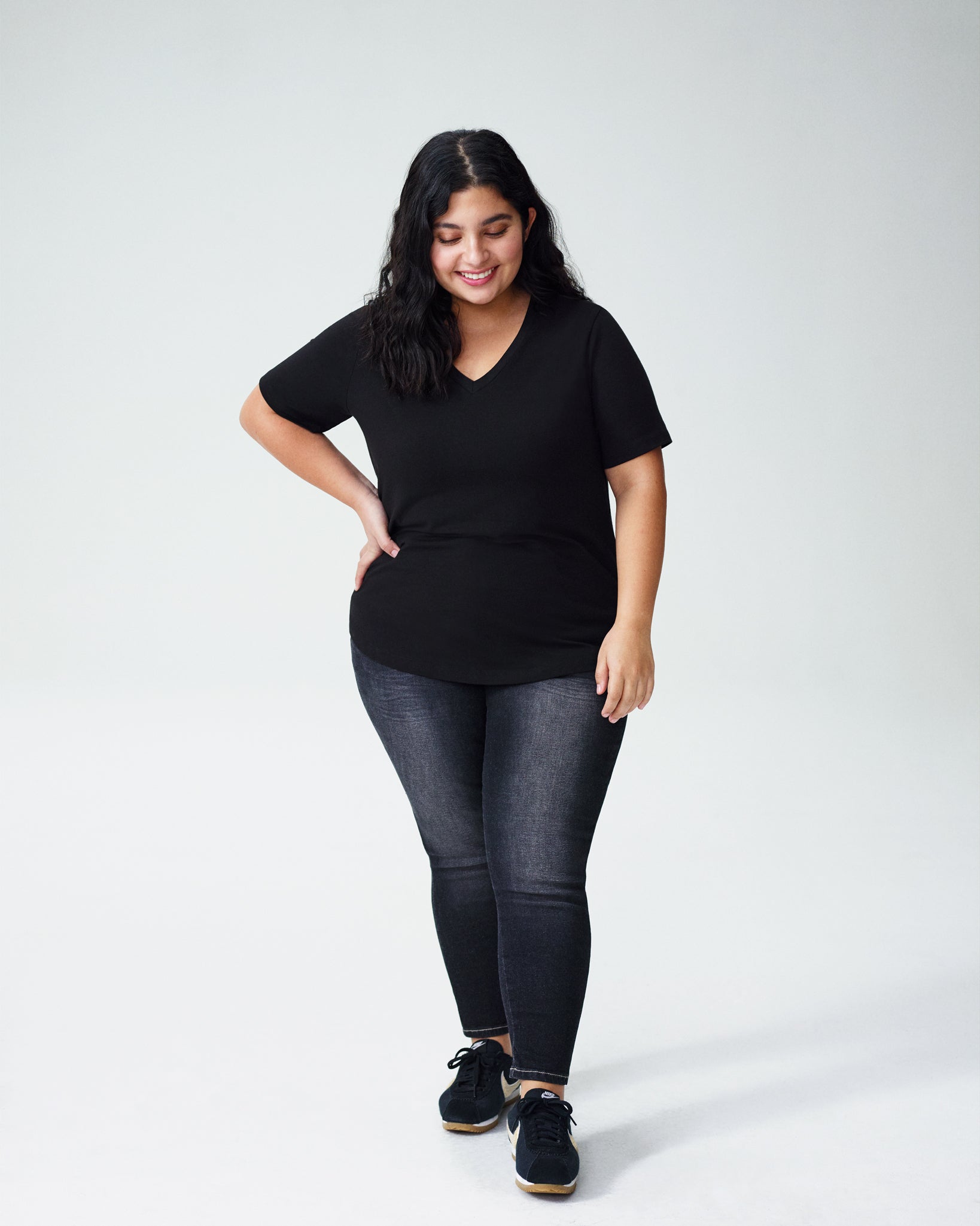 Our signature Tee Rex in a v-neck version - perfectly proportioned for petites. Carefully crafted for an impeccable fit, the V Rex is made from premium Peruvian cotton that only gets softer with every wash. A stovepipe sleeve that eliminates excess fabric, a strategically curved hem, and length that's not too long and not too short, make this tee truly one of a kind.