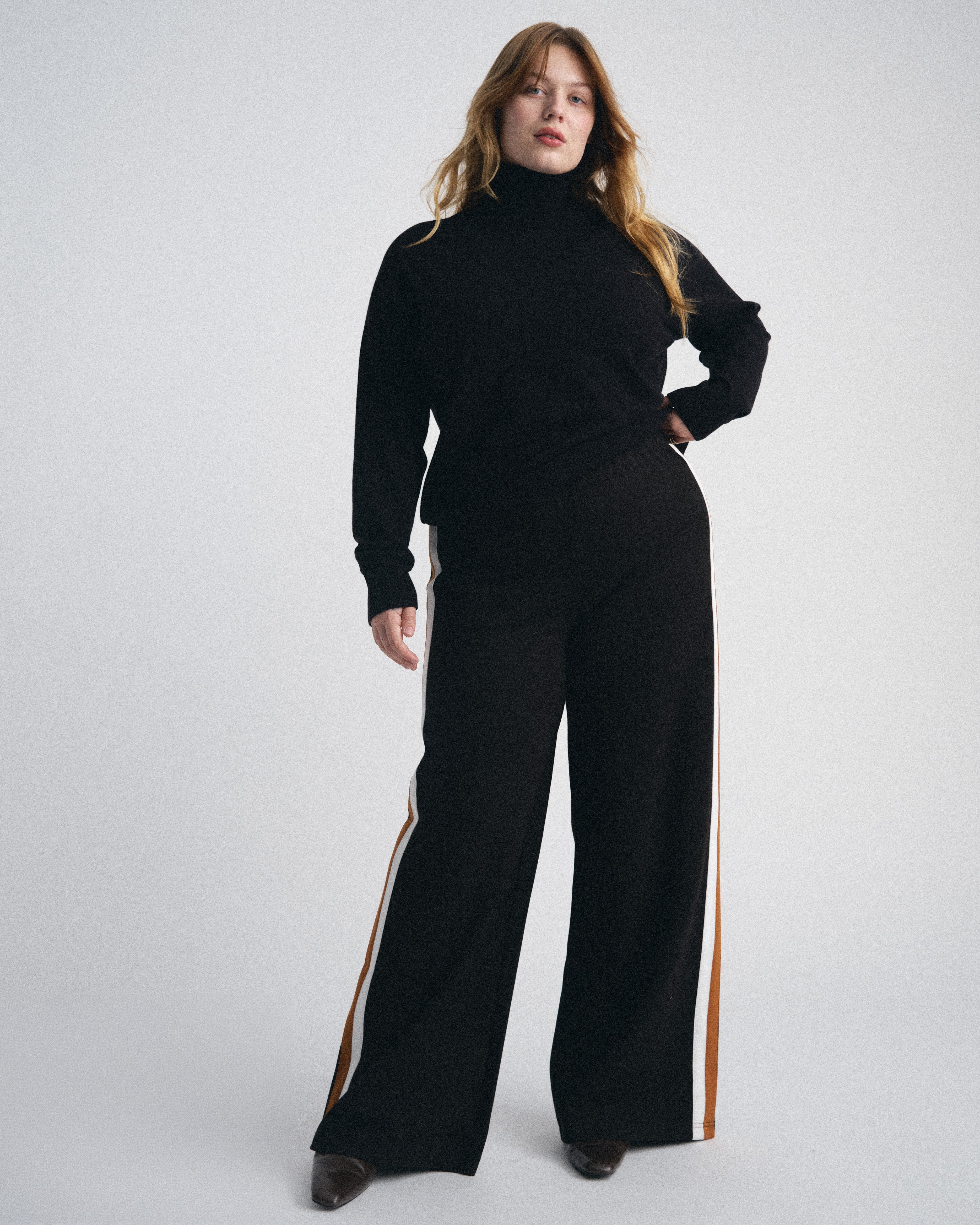 Premium wide leg ponte pants that are a little sporty and very versatile. Featuring a two-tone stripe down the sides, these pull-on pants are sleek and stretchy. The ultimate combination of style & comfort.