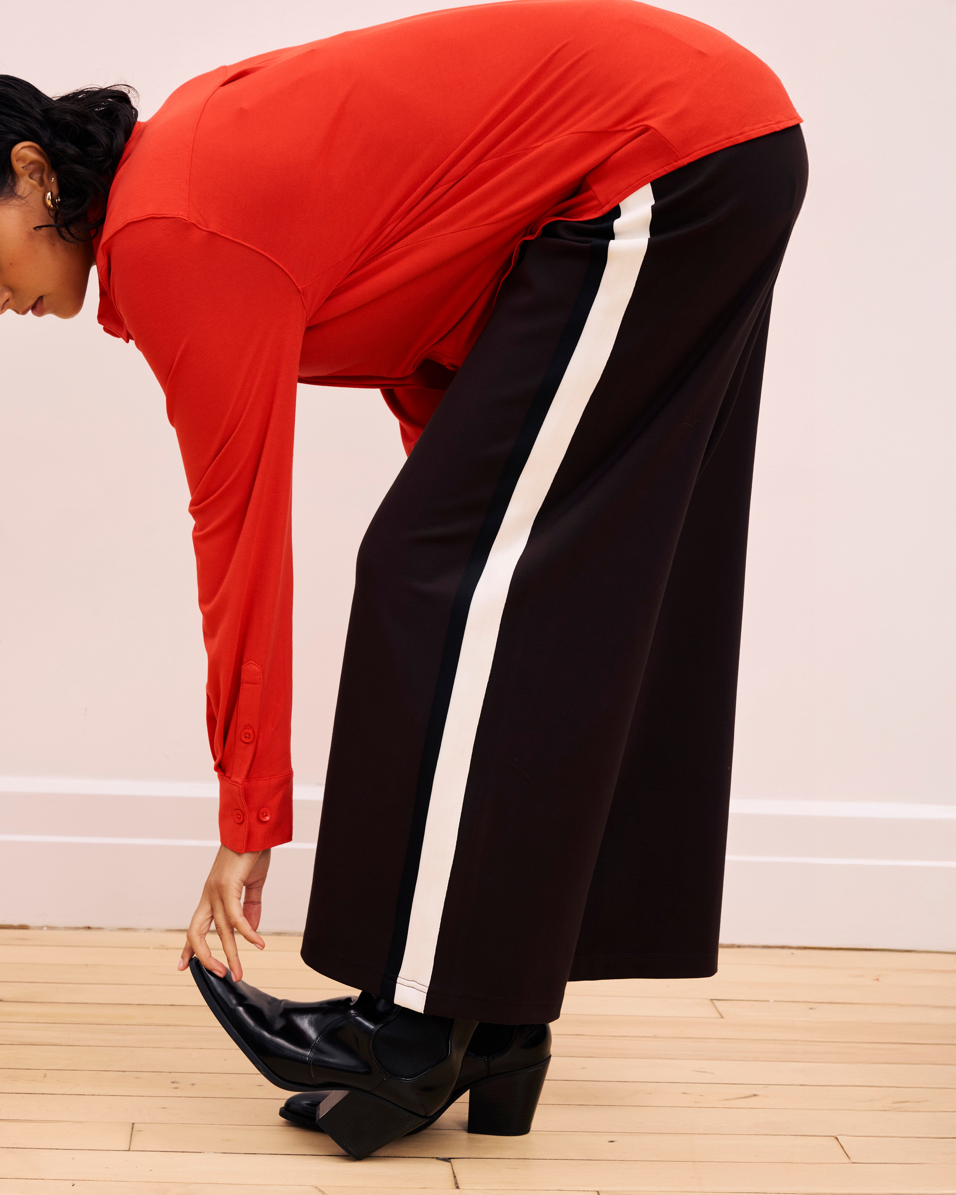 The Stephanie Pants sit at the top of everyone’s list. The fit is perfect. Trust US. We tried to make it even better and realized that it was already the best. They pull on easily, sit comfortably with an elastic waist, are fitted at the hips, and relaxed through the knee, falling to a wide leg. They’re made from premium Ponte, one of our most beloved fabrics, with a thick-knit quality, breathability, and incredible bounce back. Ponte retains its shape beautifully so that you can look great all day. Additionally, they include a stripe down the sides and a back pocket. You need these.
