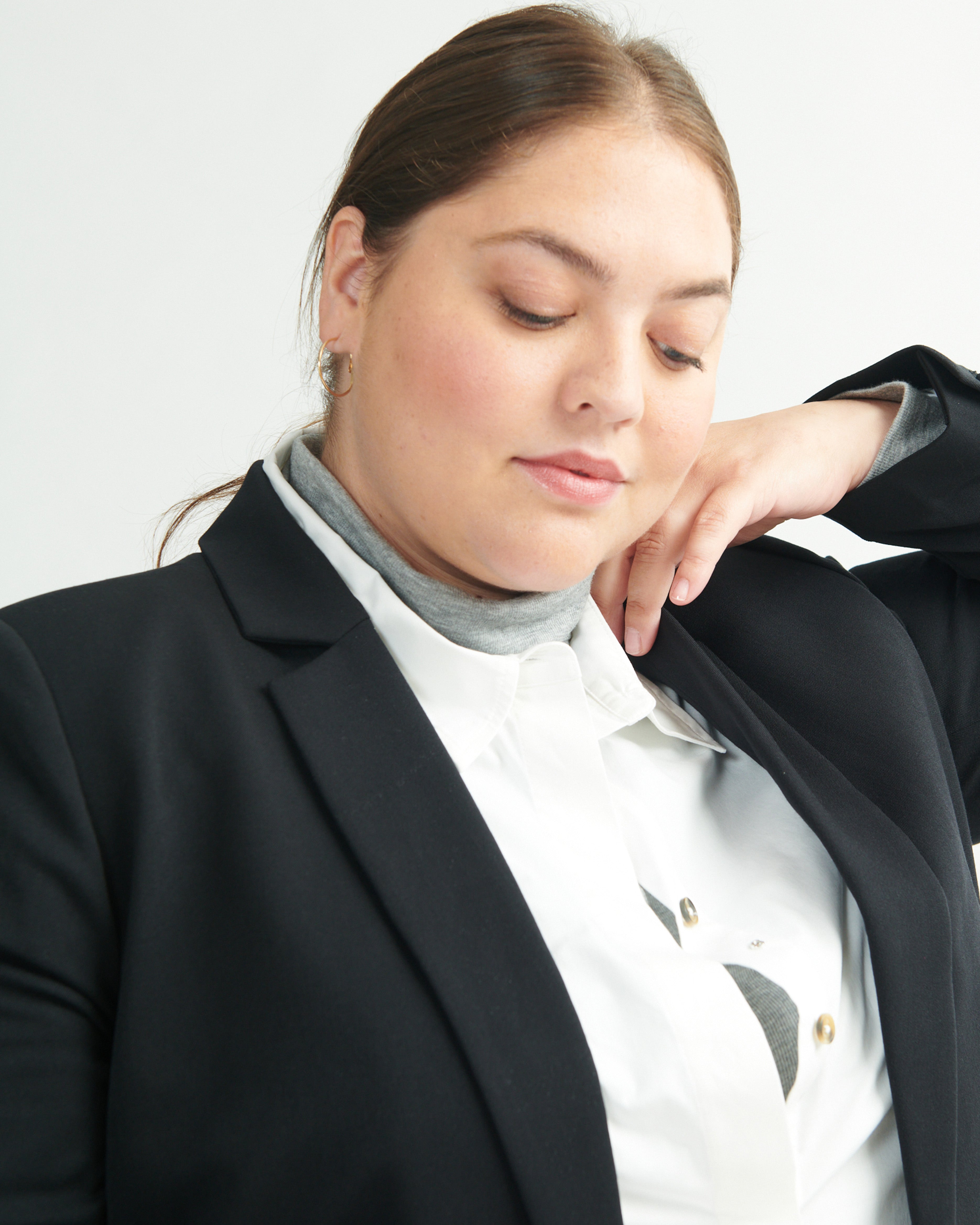 You guessed it—a blazer based on our best-selling jacket. The epitome of tailored perfection, the Beas is all about the stunning silhouette. It’s both casual and elegant. The soft and stretchy feel balances the structured look—it’s made from our premium mid-weight Ponte fabric that everyone loves for its comfort and versatility. This is a tall-friendly style because of the extra body length, and we love that it fits different body types thanks to the cutaway front, elongated back vent, and high-low hem. Half lined. Lined through the front and sleeves with butterfly lining at the back.