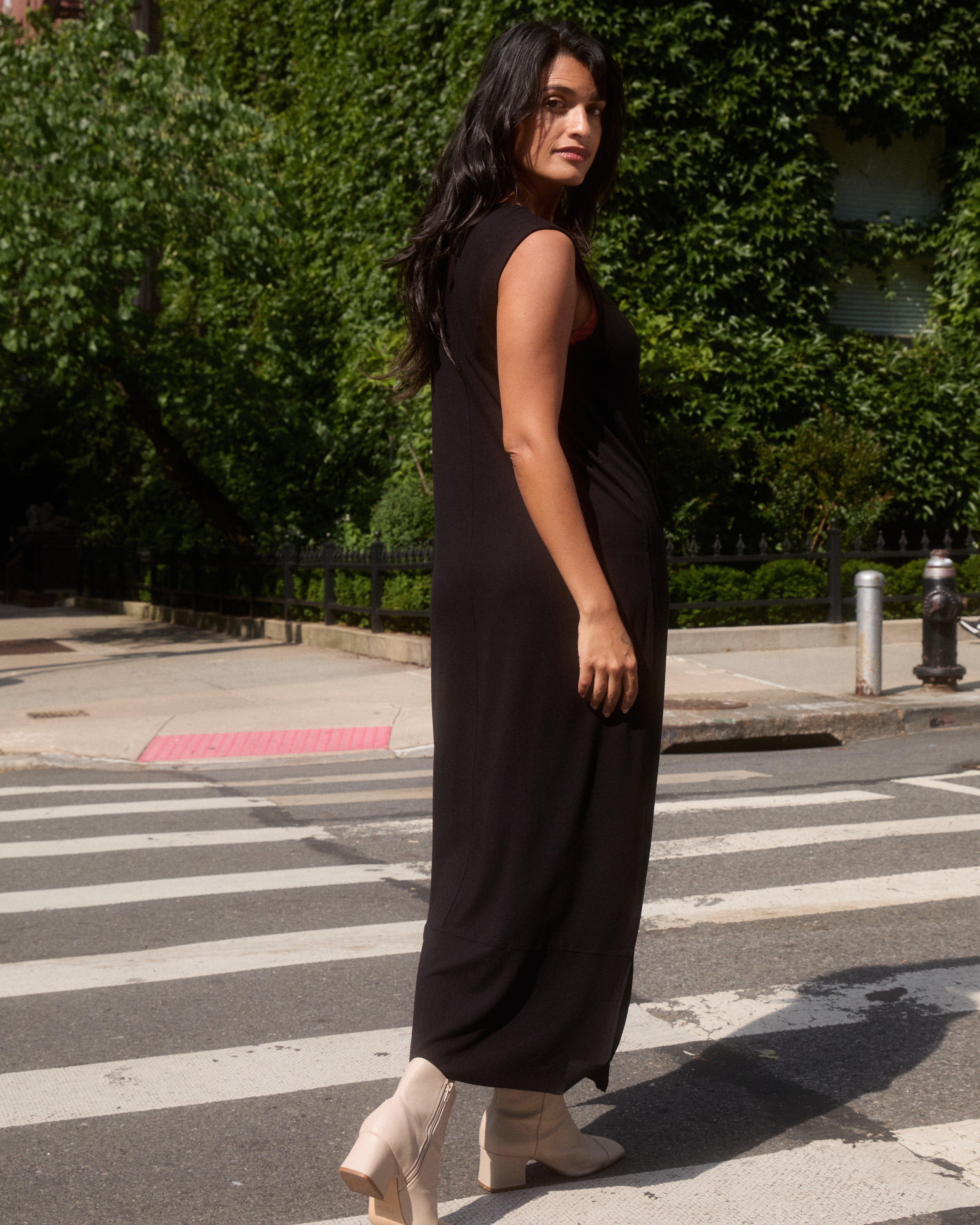 The perfect sheath dress. Long, simple, and made from our soft and drapey liquid jersey. Wear it while preparing for your backyard bash, and simply add some accessories before you host your guests. Versatility is key.