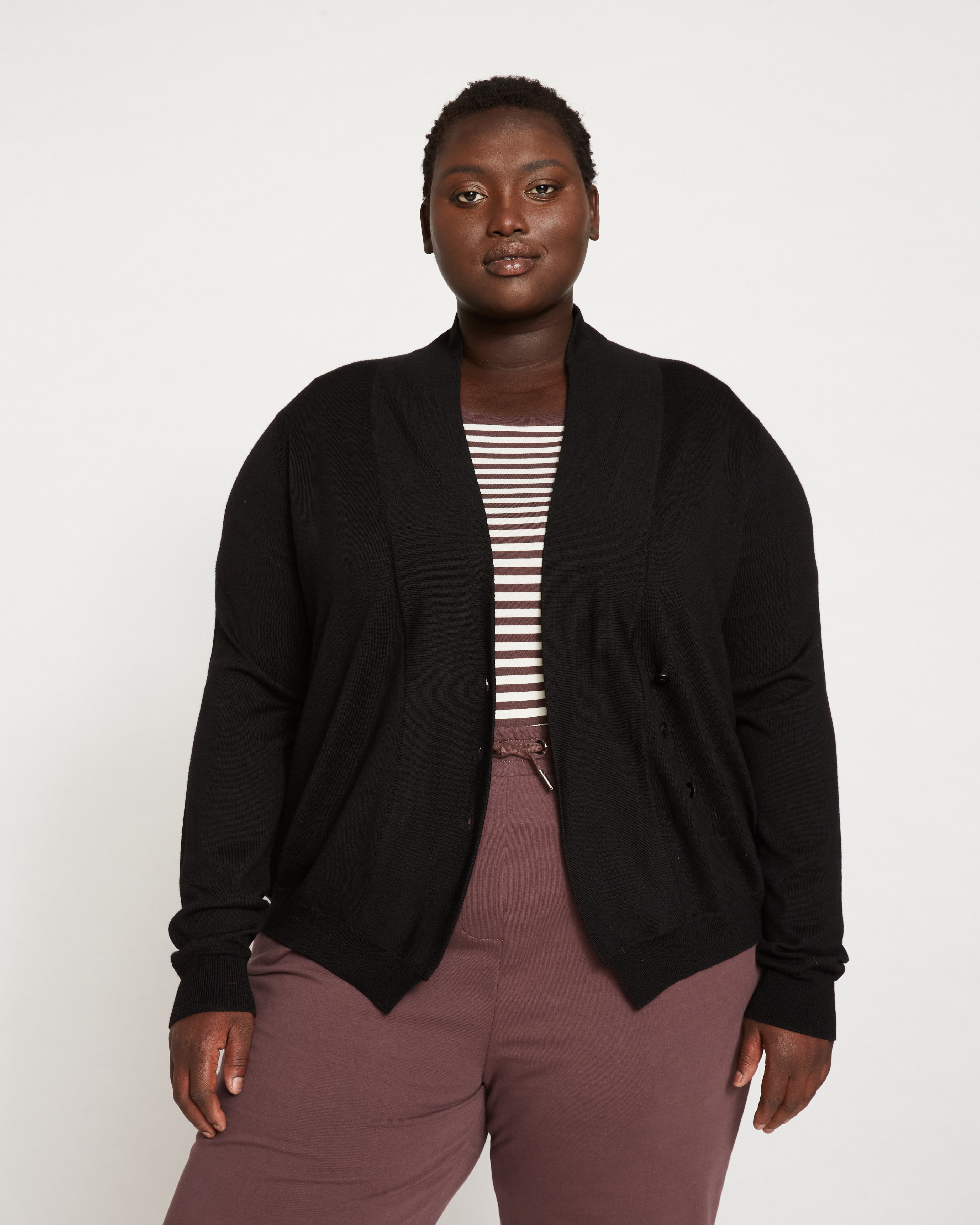 The curved-front cardigan is your go-to transitional sweater. Made of 100% Italian merino wool, it's super soft, super luxe, and super chic. Wear it over tops and tees as a light layer, or even on its own for that feminine minimalist look.