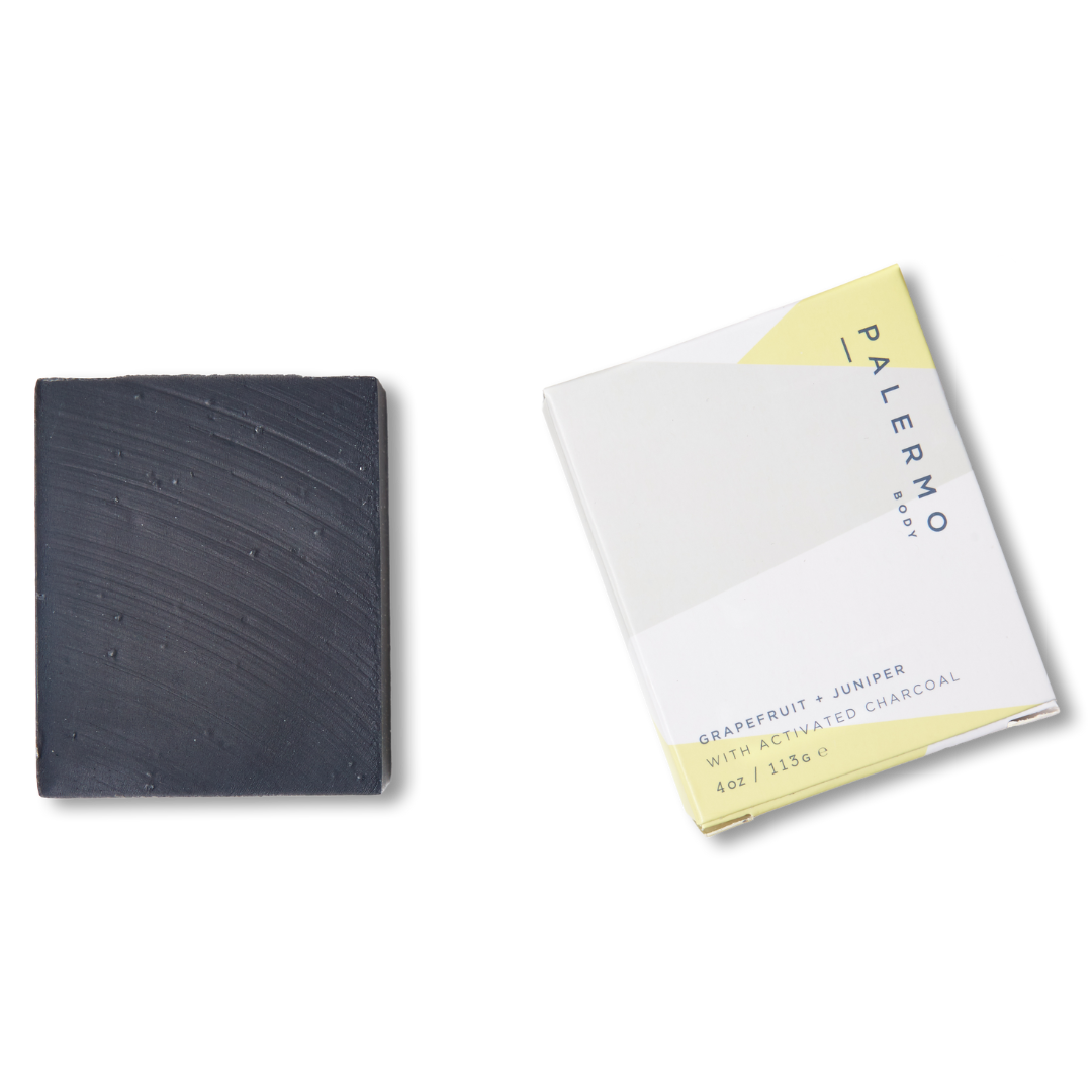 Our Grapefruit + Juniper soap is designed to deeply cleanse and detoxify oily or blemish-prone skin. Activated bamboo charcoal draws out impurities and increases circulation—kickstarting skin's natural healing process. Antioxidant and antiseptic grapefruit and juniper oils help to clear congested skin while offering an energizing, uplifting natural scent. Ideal for removing excess oil while moisturizing skin, this powerful purifier all you need for daily cleansing. Jet black, sharp scent, smooth edges—who knew bar soap could be so slick?
