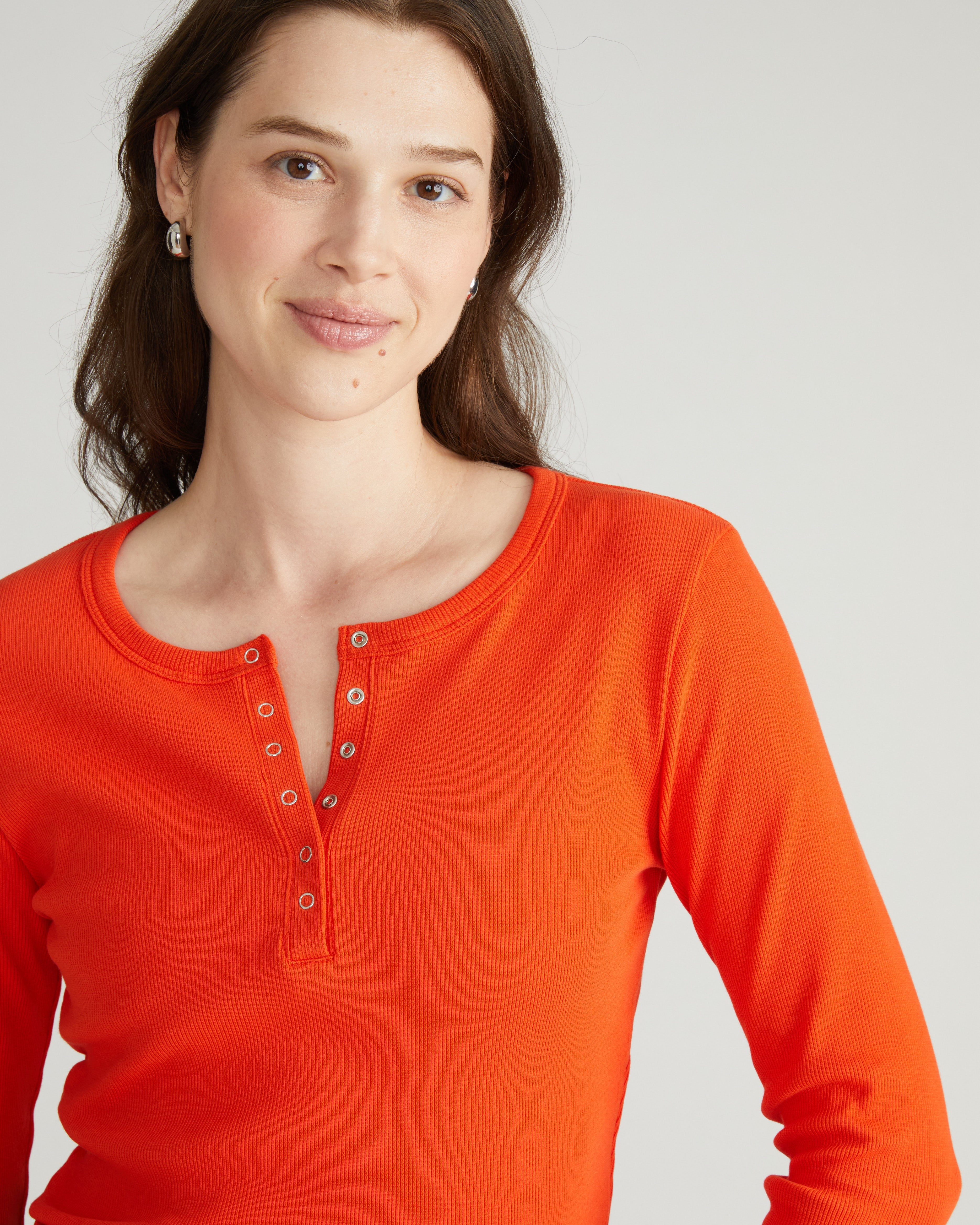 A new staple in our signature cotton rib, this fitted top features long sleeves and a classic Henley-style snap-front neckline for a timeless look. The softly textured fabric hugs the body just right, making it an effortless go-to layer you’ll keep in rotation year-round.