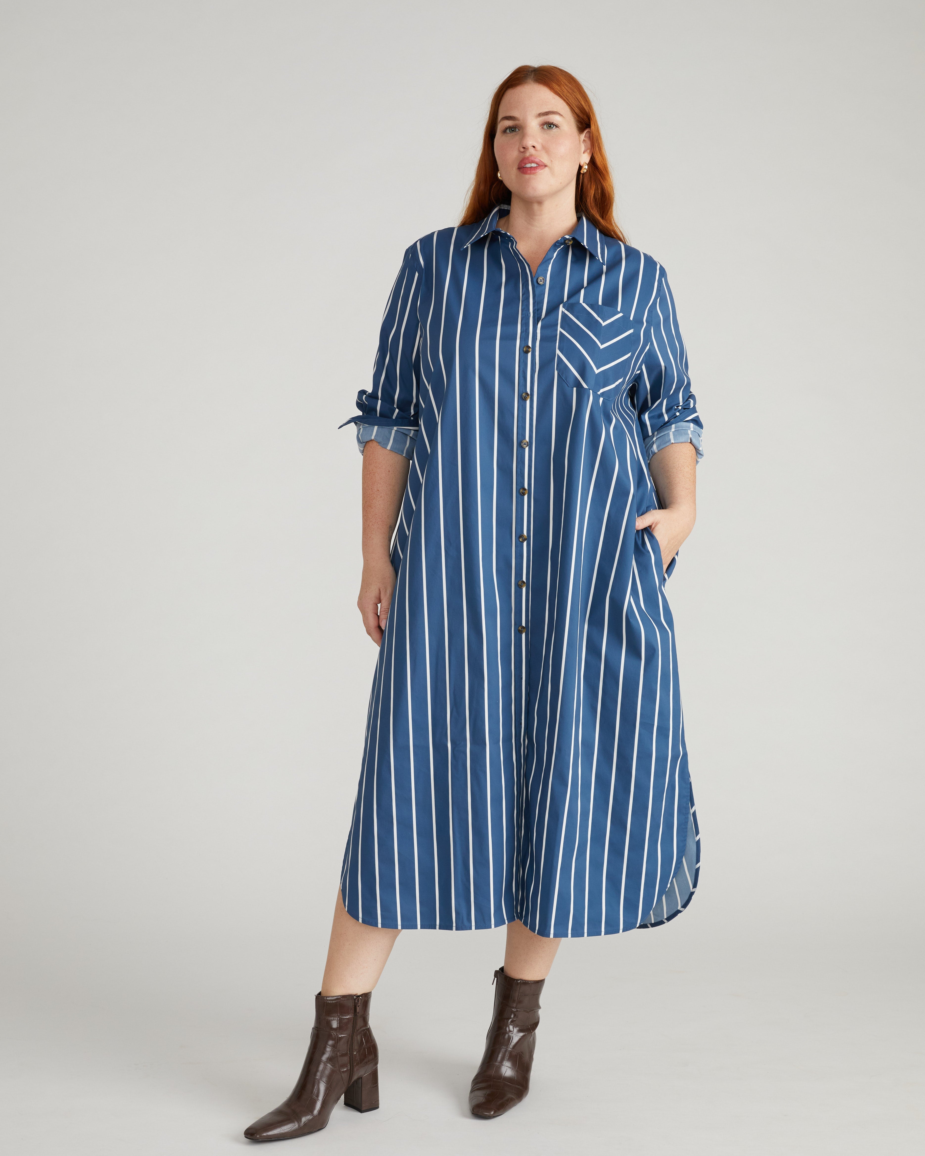 Meet the most luxurious shirtdress ever. The Odeon will make you look rich. Really. It's streamlined and simple, cut from easy and breathable cotton poplin, and features only the most considered details—a point collar, a full placket with contrast buttons, functional sleeve cuffs, and slits at the curved hem. And, while oversized, the silhouette is clean and polished.