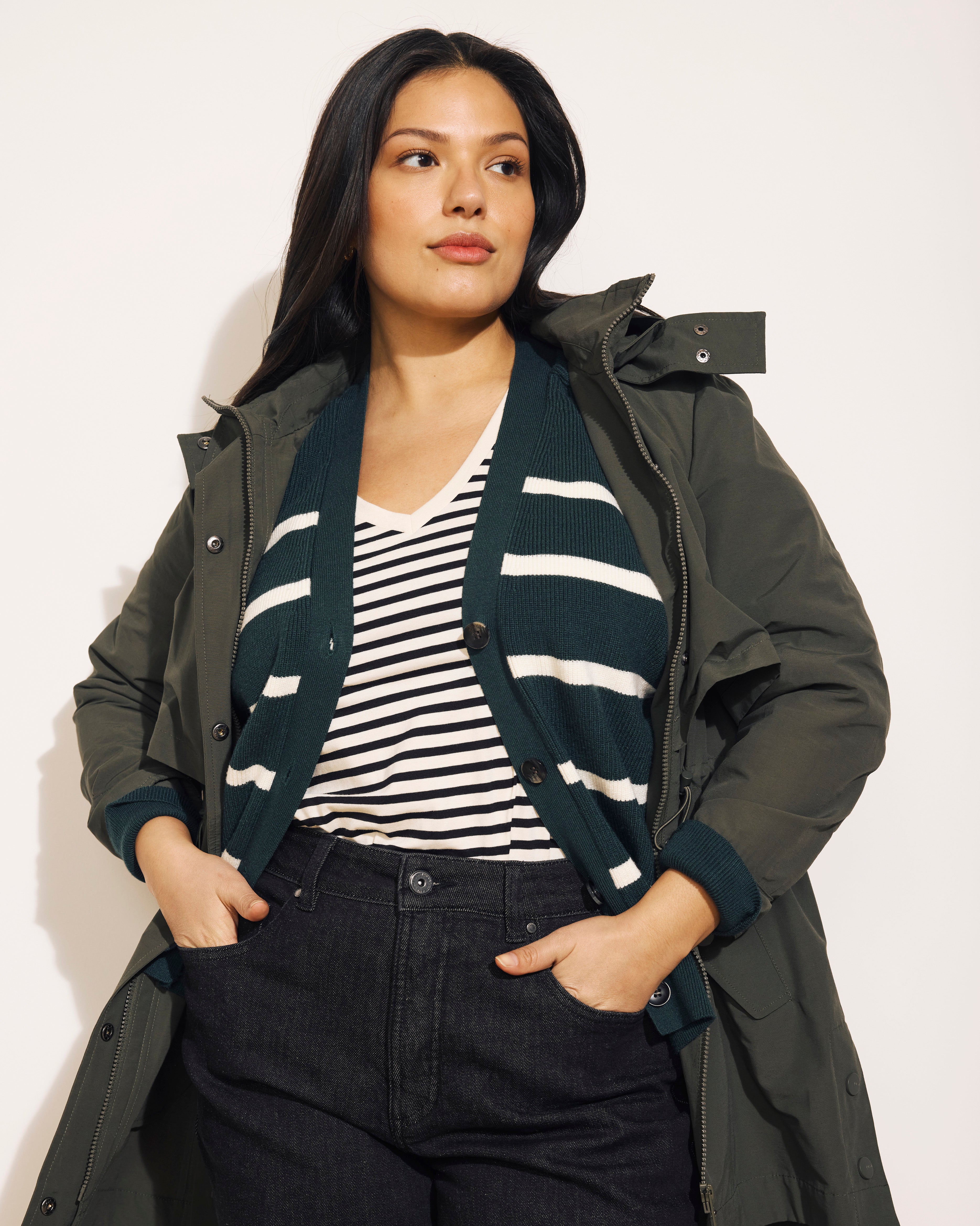 Never worry about the weather again. This is your no-problems parka. Made with absolute precision, it’s practical fashion at its finest. The fabric is water-resistant, the details are purposeful, and the fit is fantastic. You’ll never need another raincoat again. Key features include the wire rimmed hood (so those rain droplets stay out of your face), a storm collar and storm flap, snaps to close, a drawcord, and easy-access pockets.